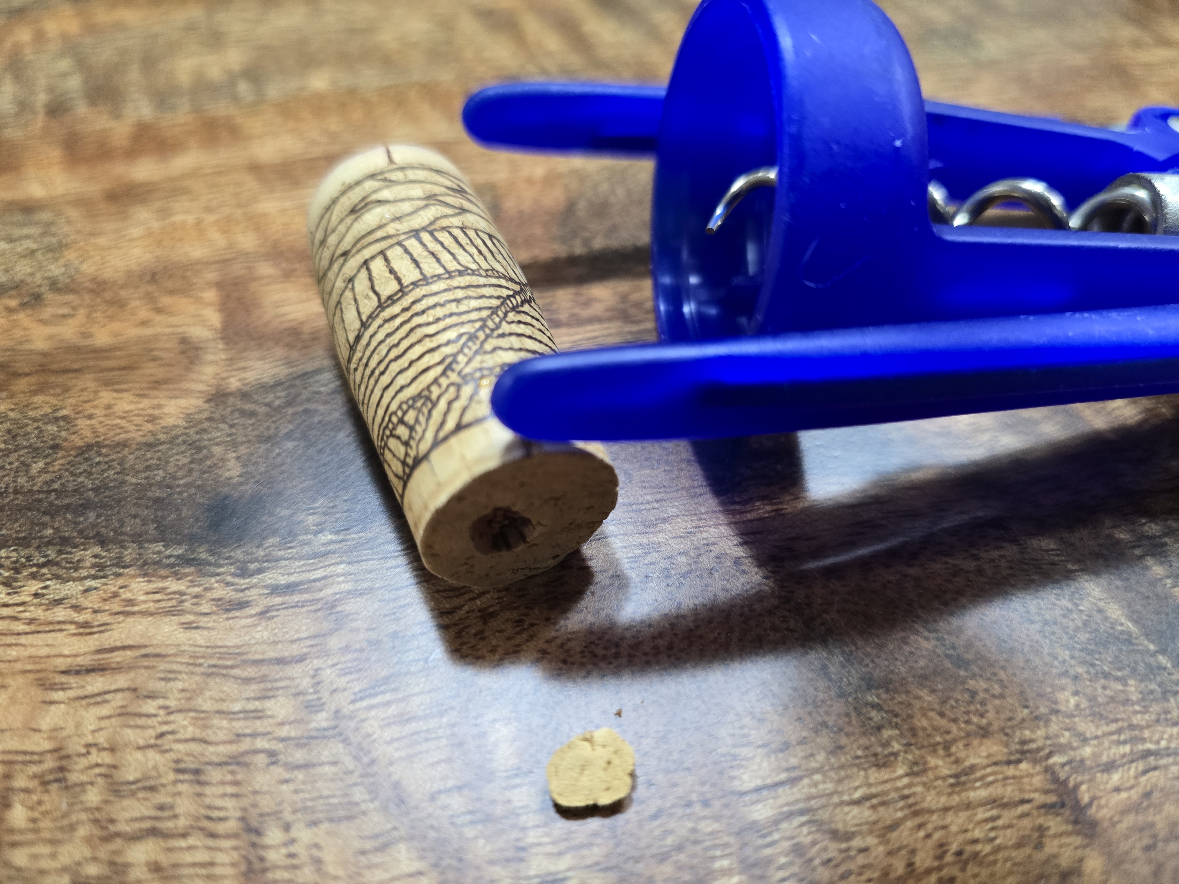 중요한 것은 코르크를 최소한의 손상없이 빼내는 것입니다. 순수 코르크는 빼는 과정에서 잘 부러지는 특성이 있습니다. 최대한 조심조심 빼냈다고 생각했는데 끝단이 조그만 조각이 떨어졌습니다.